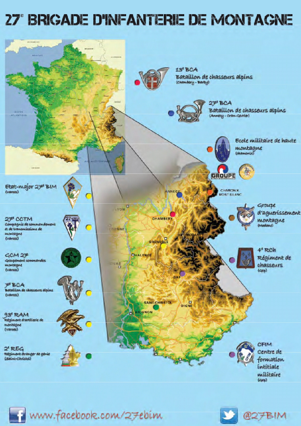 - capacité infanterie : 3 bataillons de chasseurs alpins (7e BCA, 13e BCA, 27e BCA)